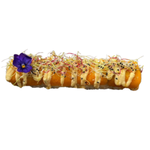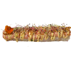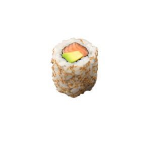 Crevette tempura, cream cheese, saumon braisé, avocat, sésame