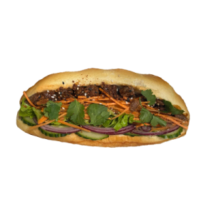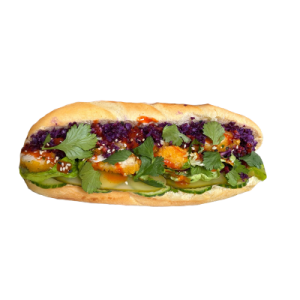 Salade, concombre, pickles de cornichons, chou rouge, oignons frits, mayonnaise, srirasha, poulet crousti, coriandre, sésame, boisson et dessert">
