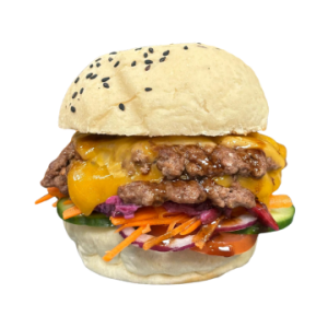 Pain Bao, double steak haché smashé, beurre de cacahuète, tomate, oignon, carotte, concombre, chou rouge, cheddar affiné, coriandre, sauce bulldog, servi avec potatoes maison, boisson et dessert"> -
