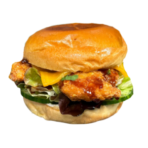 Pain bun’s, poulet crousti, salade, concombre, oignon, cheddar affiné, sauce crème maison, servi avec potatoes maison, boisson et dessert"> -