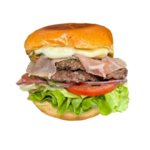 Pain bun’s, double steak haché smashé, jambon cru, tomate, oignon, tomate séchée, sauce mayo-pesto vert, mozzarella, servi avec potatoes maison, boisson et dessert"> -