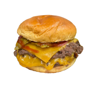 Pain bun’s, double steak haché smashé, tomate, pickles d’oignon maison, cornichons, cheddar affiné, ketchup, moutarde, sauce burger, servi avec potatoes maison, boisson et dessert"> -