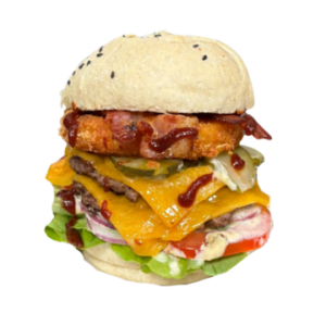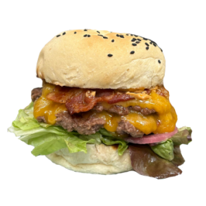 Pain Bao, double steak haché smashé, salade, tomate, pickles d’oignon maison, cornichons, sauce tasty, poitrine de porc fumée sauce barbecue, cheddar affiné, servi avec potatoes maison, boisson et dessert"> -